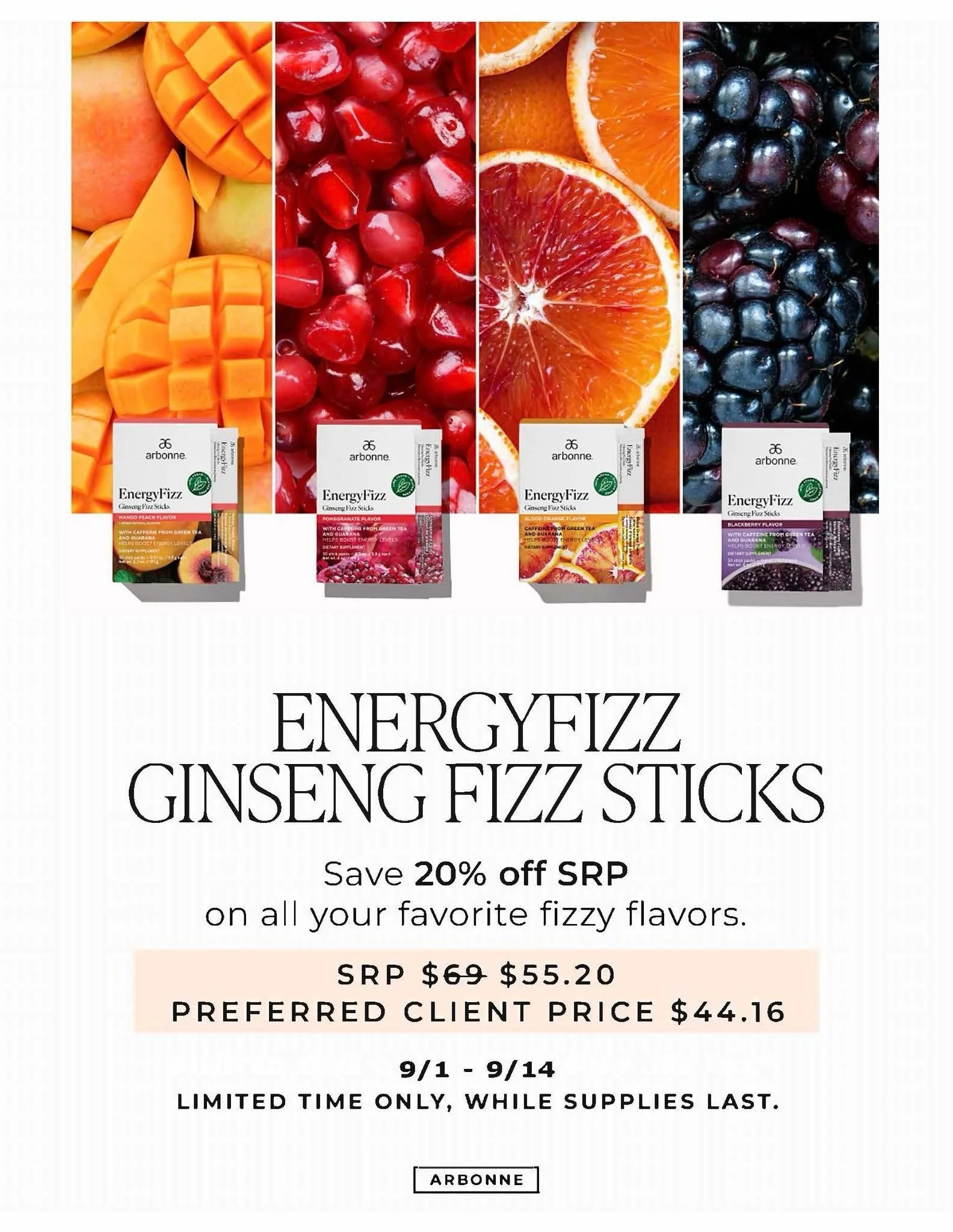 If you've been waiting until the price is right, guess what stackable deals happening this month !! These products are worth full retail price. not only are they delicious but they do what they say they're going to do (when you are CONSISTENT ppl) investing in your health is 100% worth it every time, but i love being able to help you mamas save $$ when I can. This offer ends on Sept 14th so act fast! 20% OFF SRP EnergyFizz Ginseng Fizz Sticks! Flavors include, Blood Orange, Pomegranate, Mango Peach, Blackberry (while supplies last). Includes option to select a free gift